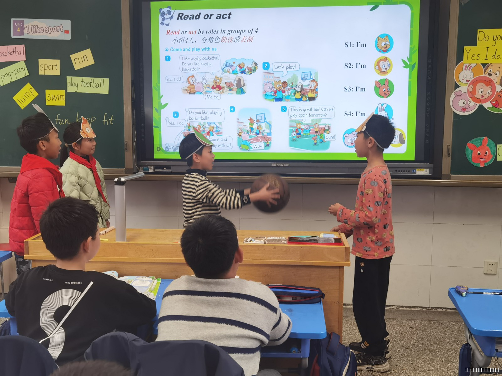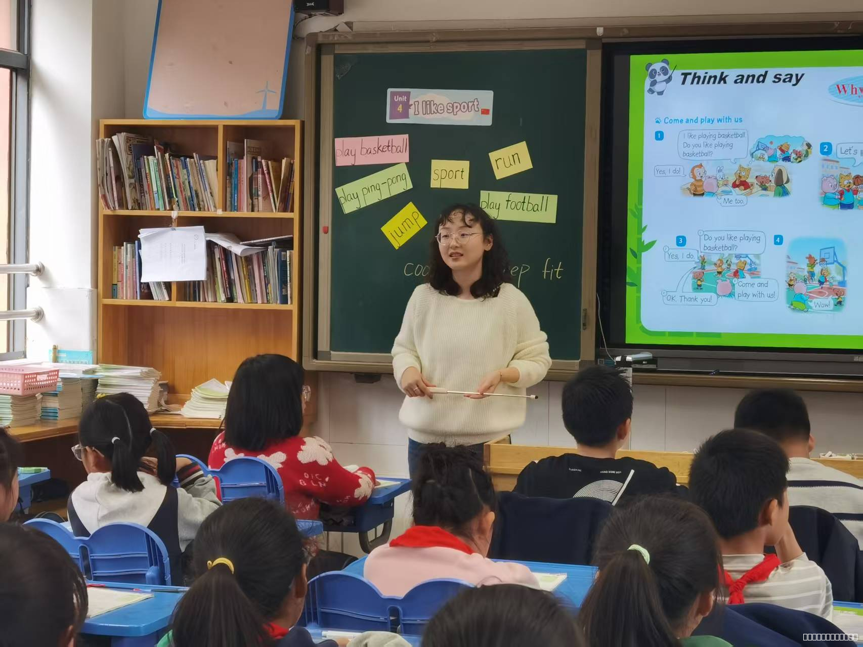 导入环节,沙老师以“sports song”激活氛围,随后引导学生观察单元主题图,以“Who are they?、Where are they?”等问题链引导讨论,自然引出“I like sport”核心主题。接着,沙老师围绕“Big question”——“What sport do you like and why?”展开教学,通过“What sport does Little Panda like?”、“What sport does Sam and his friend like?”、“What sport does the boy and the girl like?”三个问题串联教学,帮助学生逐步深化对“Big question”的理解。最后,通过问题“What sport do you like and why?”链接学生生活,升华主题。